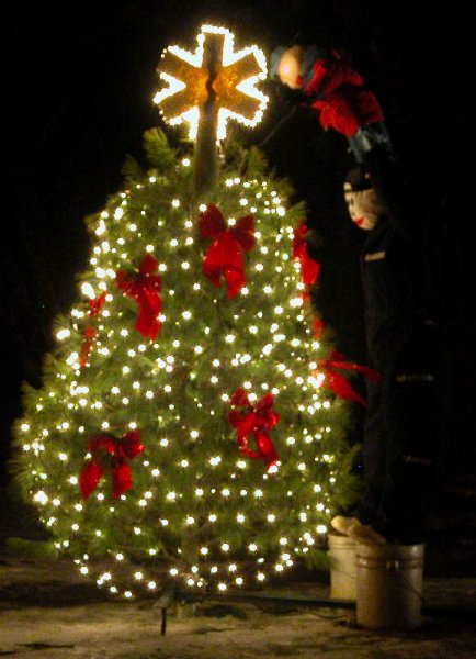 Getting a little help placing that tree topper up there. I hope he doesn't fall off those buckets, or he might need a first responder. |