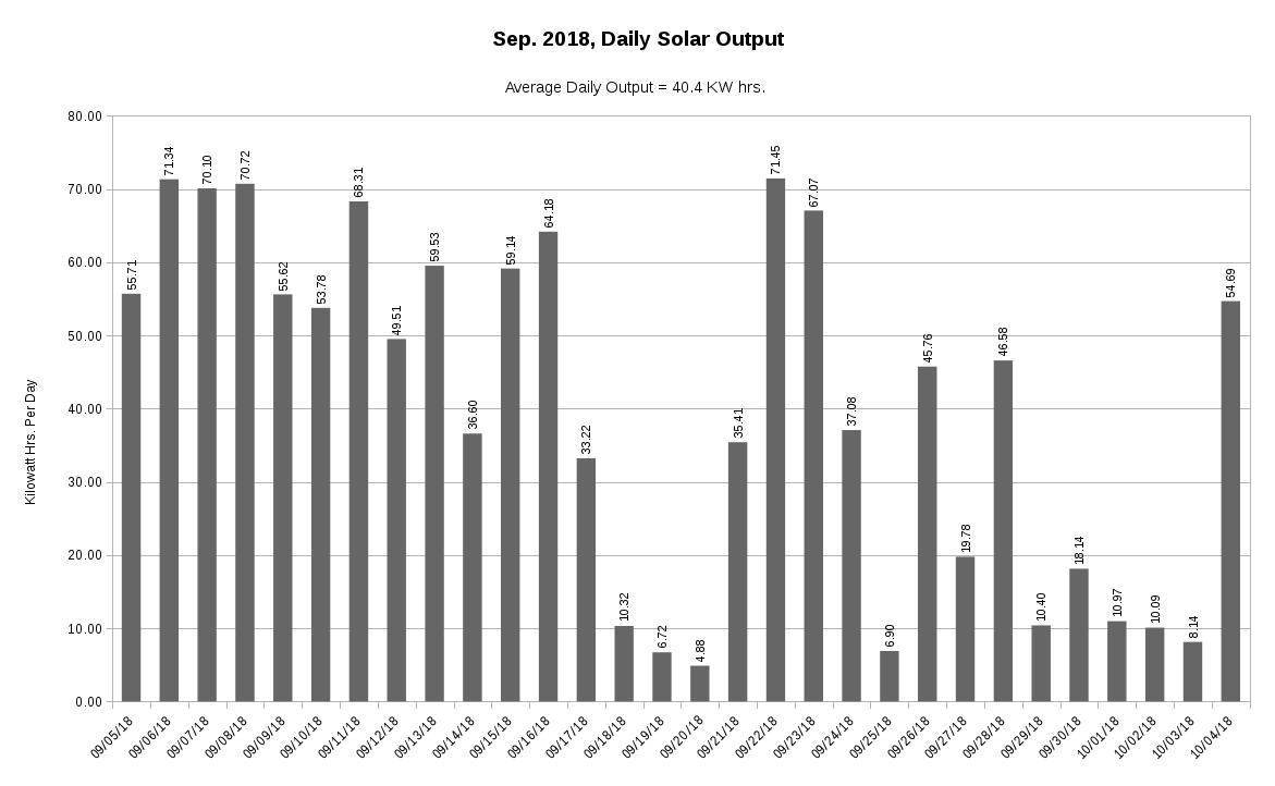 So, to put it all together, “10.8 kilowatts”, (the rated size of our system) TIMES “4 peak hours per day” TIMES “0.8” (to reflect a 20% drop in production) EQUALS “34.56” kilowatts per day. As time goes on we’ll see how accurate these predictions are. If you have any questions or comments please click the link below to send me an email.