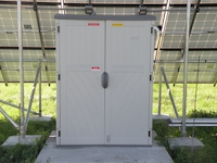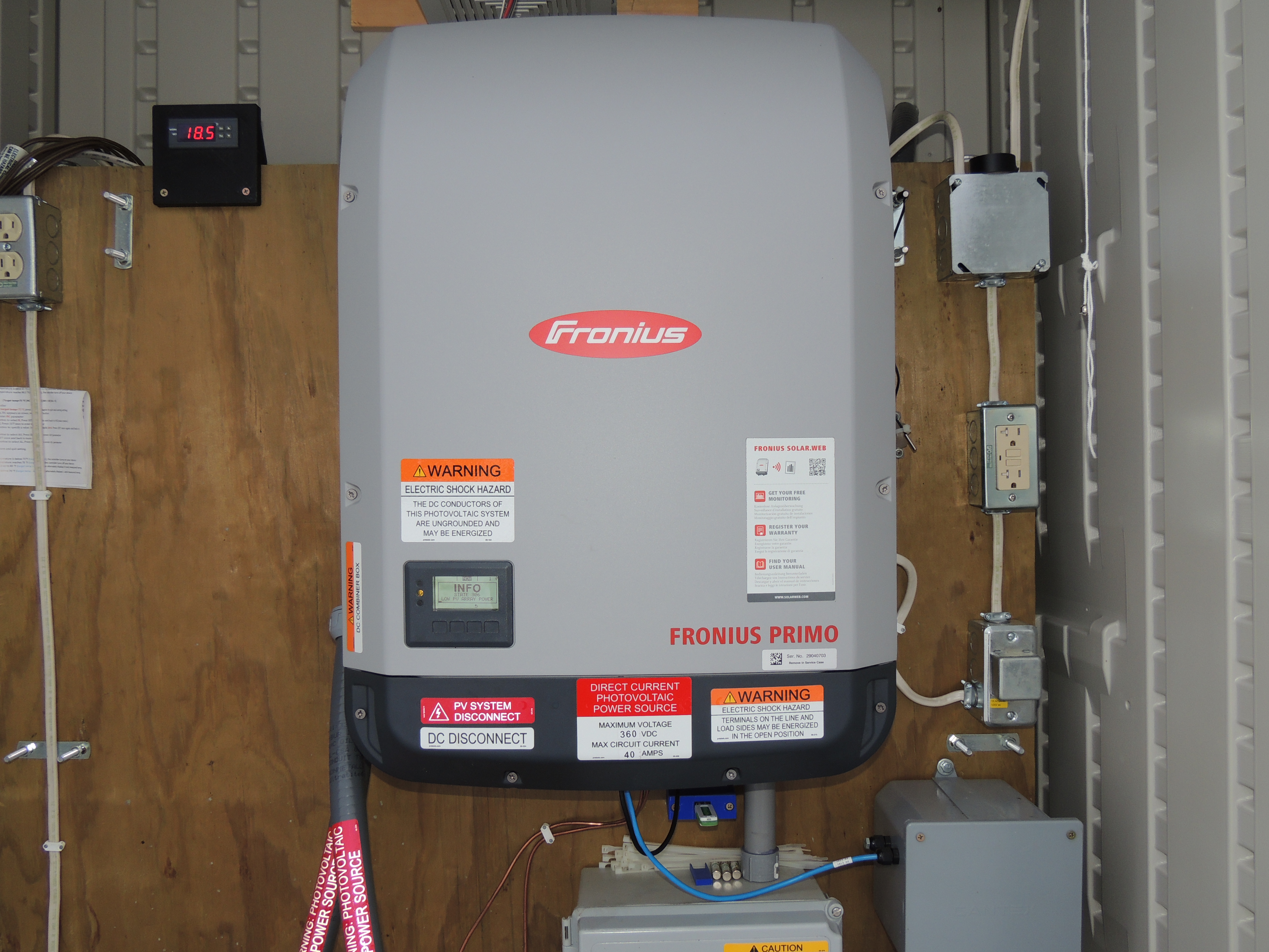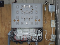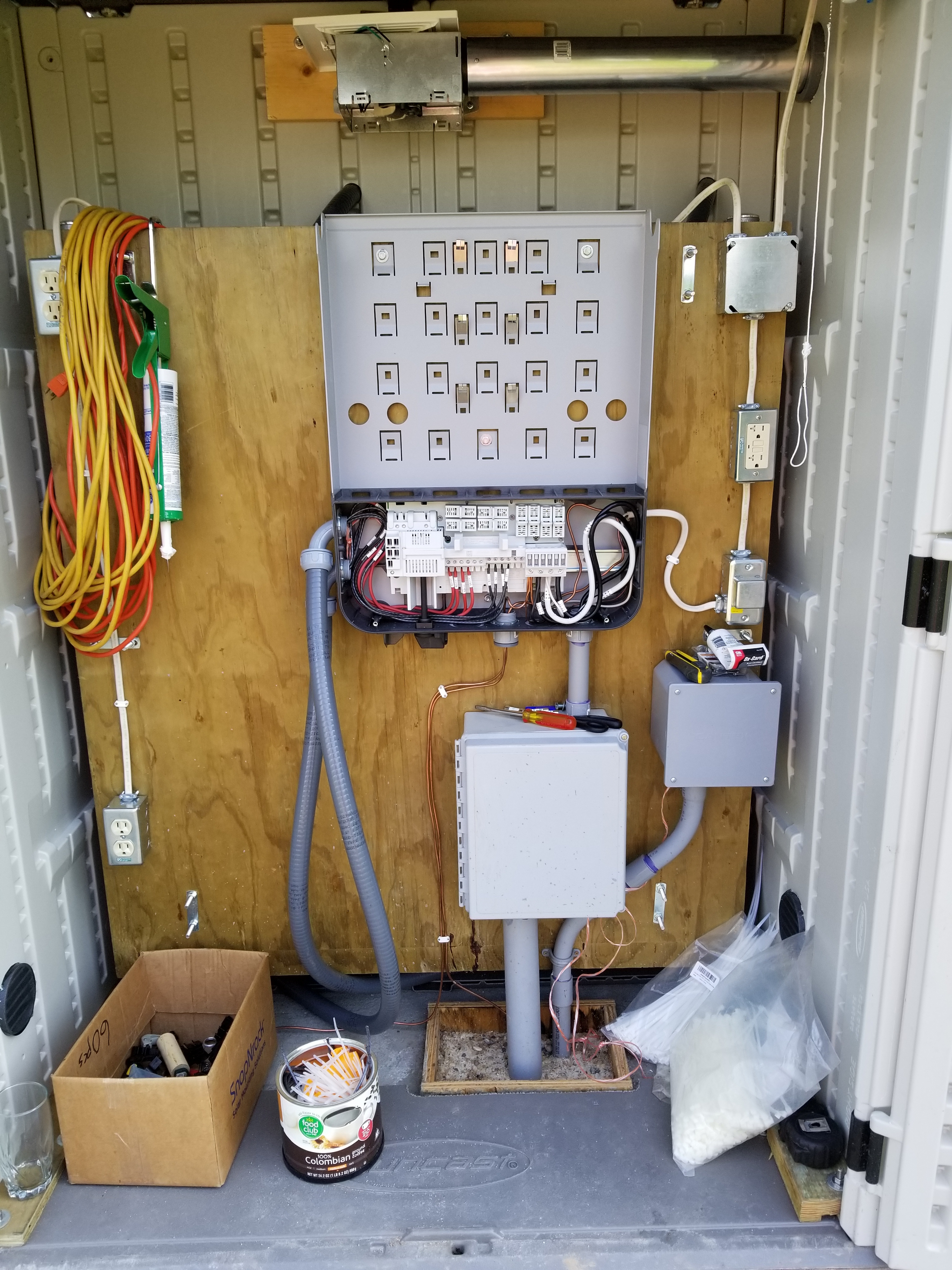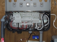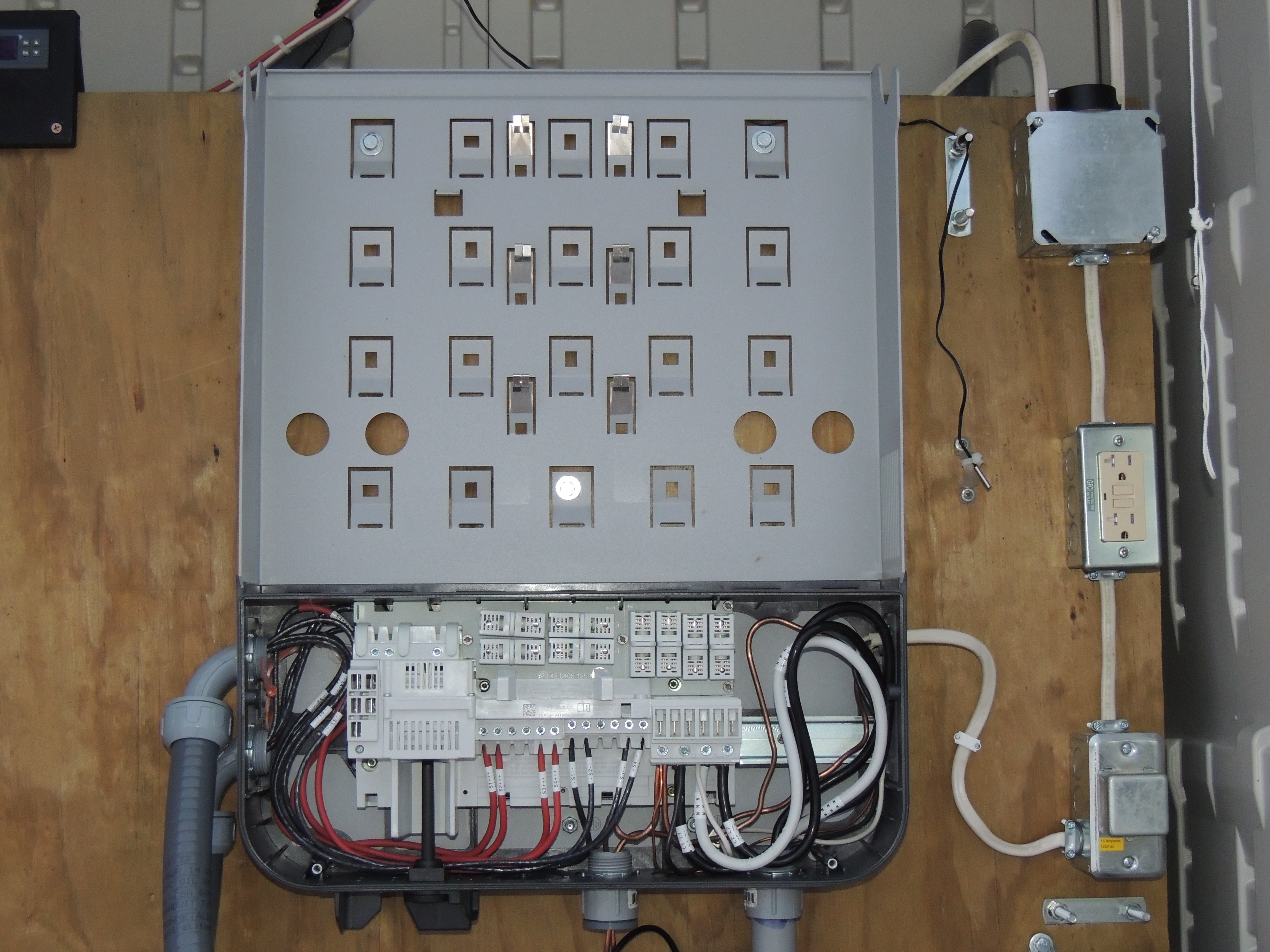 The large box with the exposed wiring is the mount for the Fronius solar inverter. The D.C. voltage comes in from the solar panels on the left side. The RED wires are simply black wires covered with red heat shrink to differentiate the positive and negative leads. The A.C. voltage goes out the right side. The large WHITE wire again, is simply a black wire with white heat shrink, to show that it is the neutral wire. The large bare wire is of course the #6 awg ground wire that I mentioned a few pictures up. The smaller wires are the ‘Hot’ (L1) neutral and ground of the small branch circuit to supply power to the outlets and fan. |
