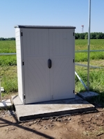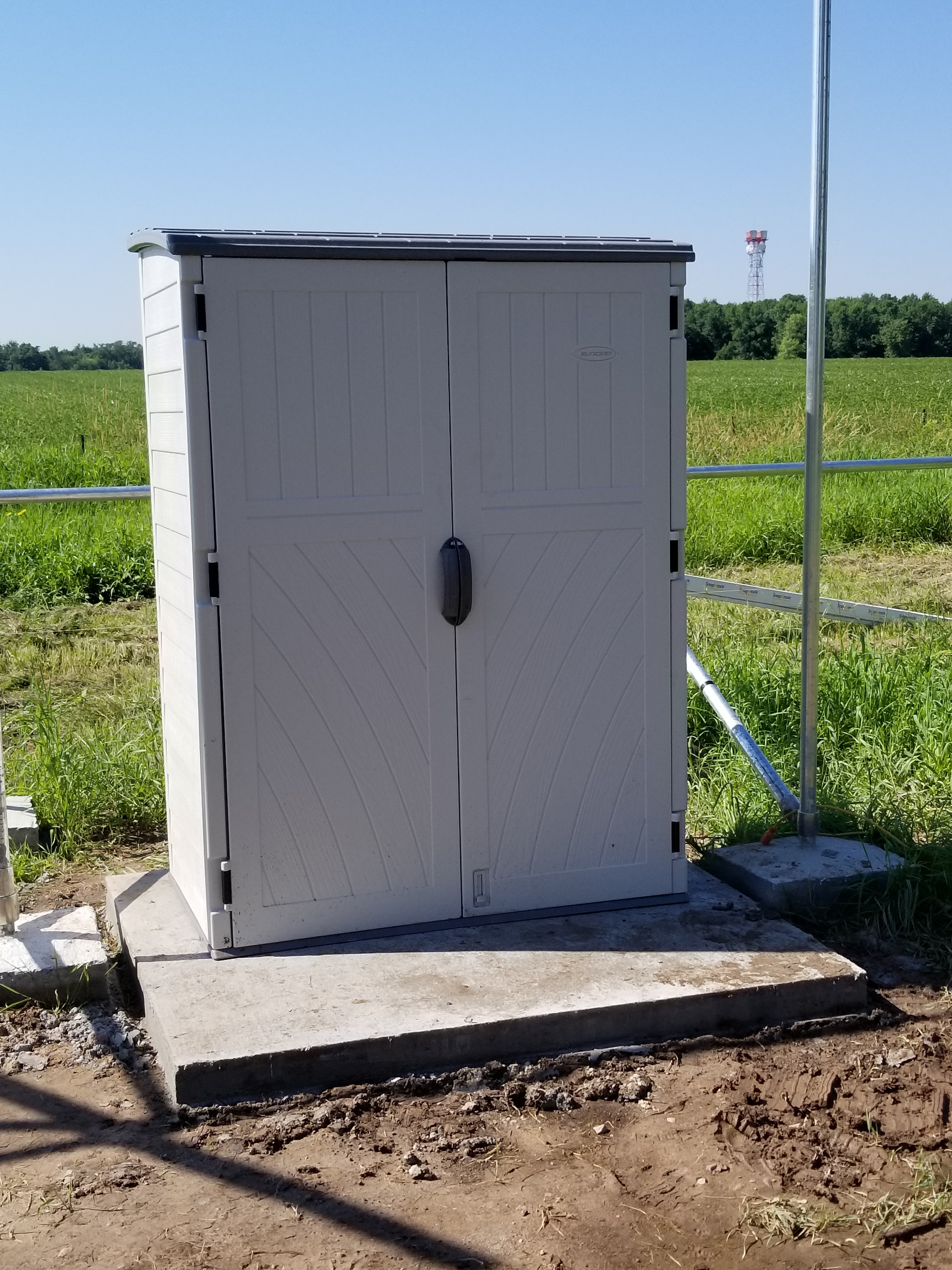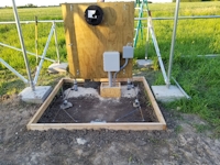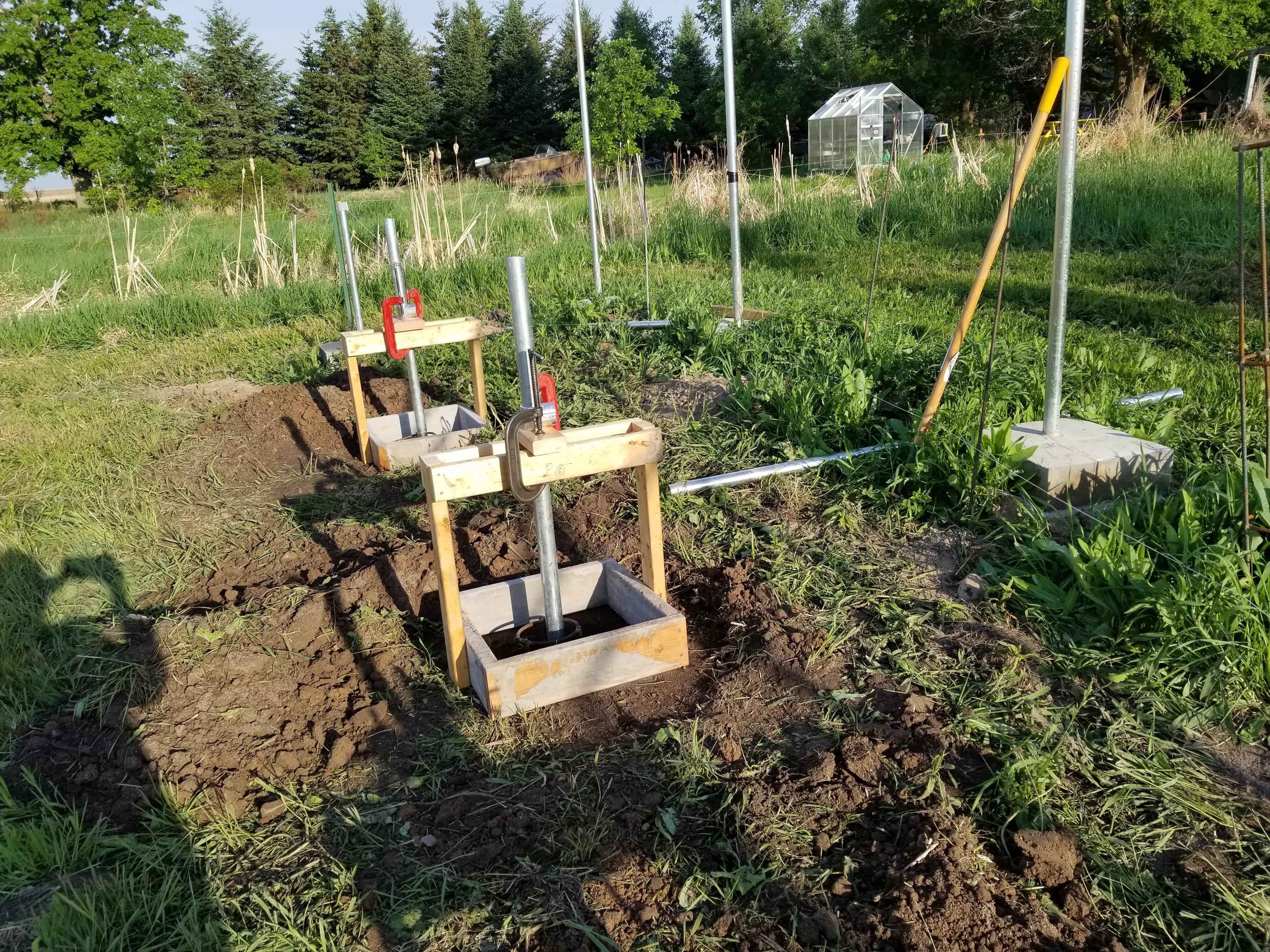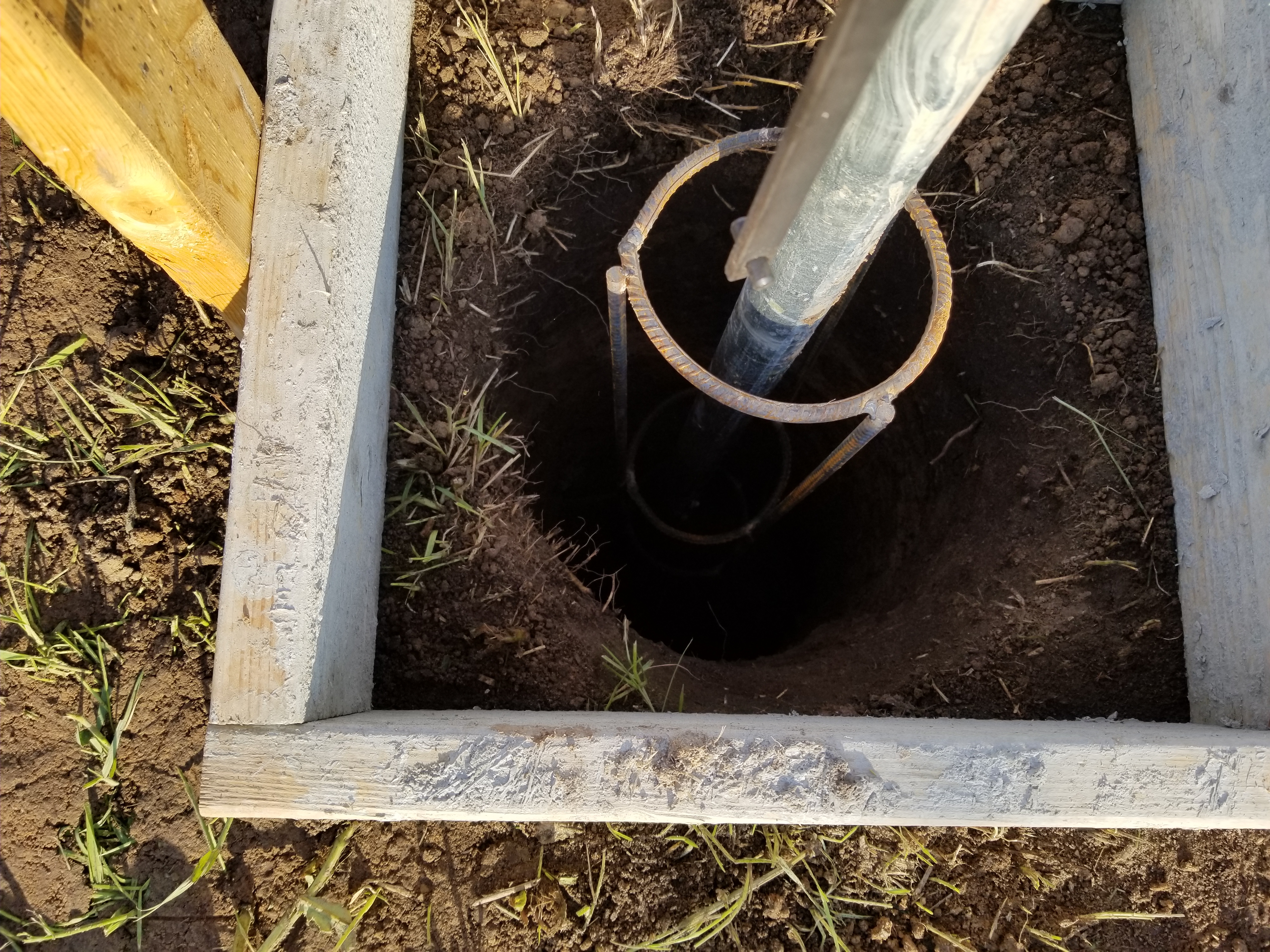 NOTE, the small wood box, around the conduit, and the short pieces of PVC around the two poles. The idea here is knowing that the cement slab is going to move around a little bit, due to the frost, we are hoping to isolate the slab from the poles and the conduit to allow the slab to move without putting pressure on the poles and conduit. We’ll see in a few years how that all works out. The PVC was a cut from an extra piece of conduit that I split in half with a hack saw. I then taped it back together around the poles with electrical tape. The re-rod has vertical threaded rods welded to it to eventually bolt down the ‘Fronious Closet’. |