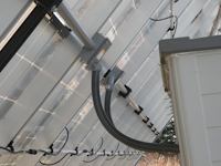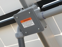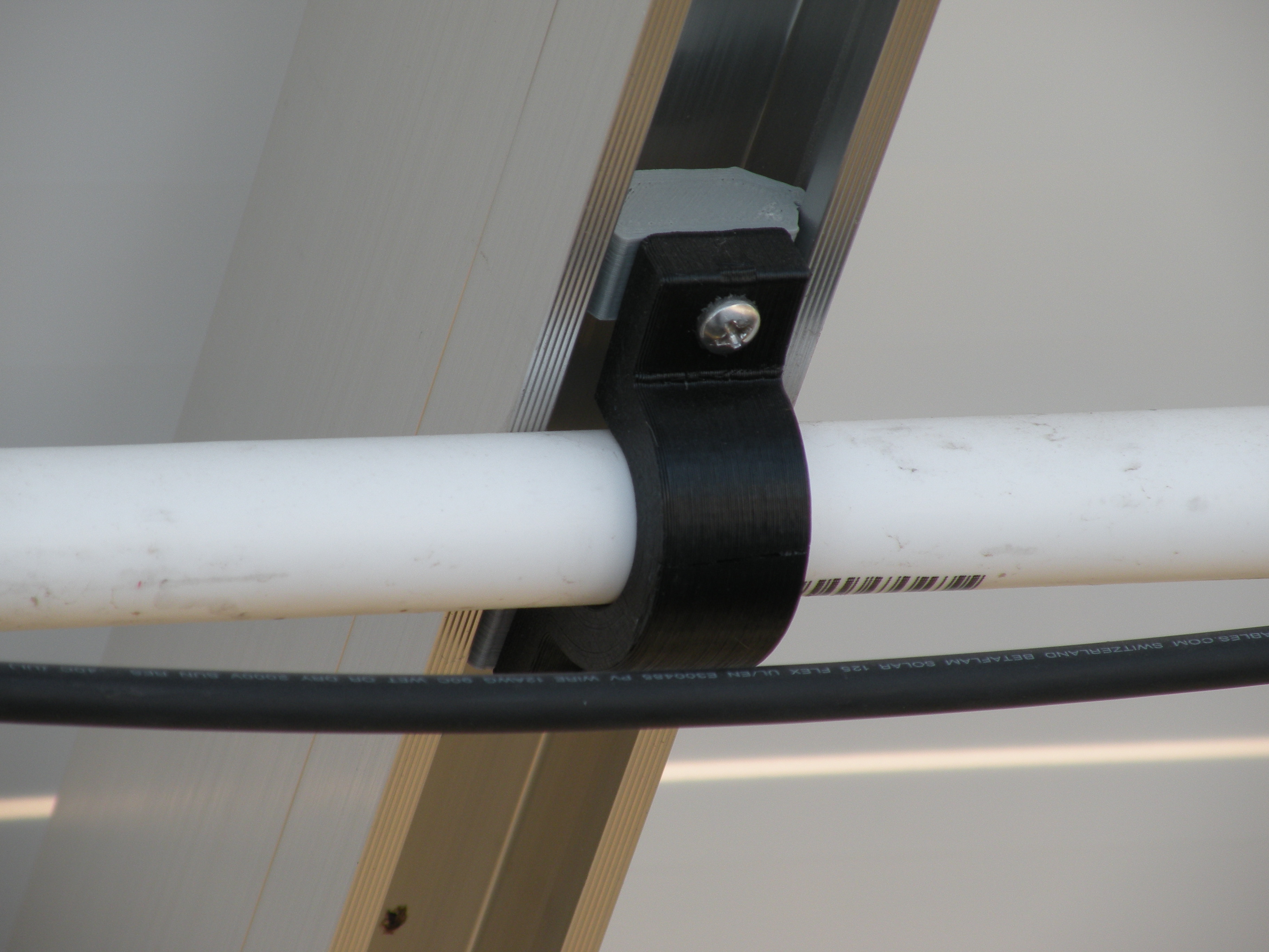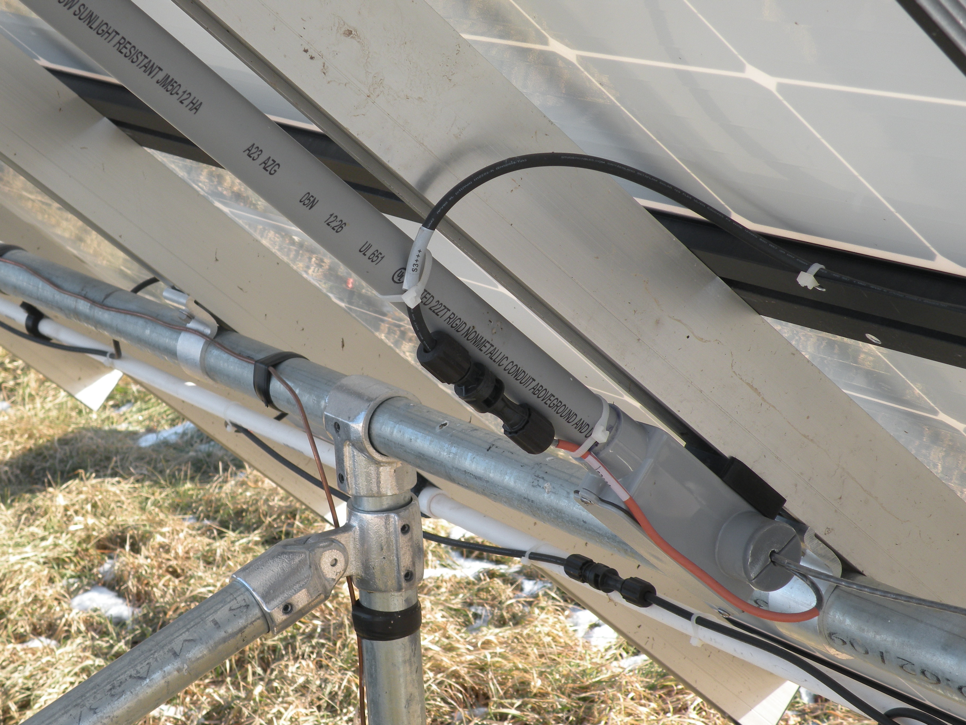These are the Home Run conduits leading to the junction box that transition to the flexible conduits that go to the Fronius inverter. These conduits are anchored to the back side of the panel mount rails using the snap in bolt mounts, and the conduit clamps that we 3D printed. |
