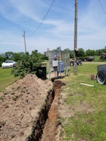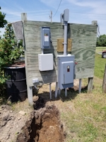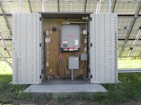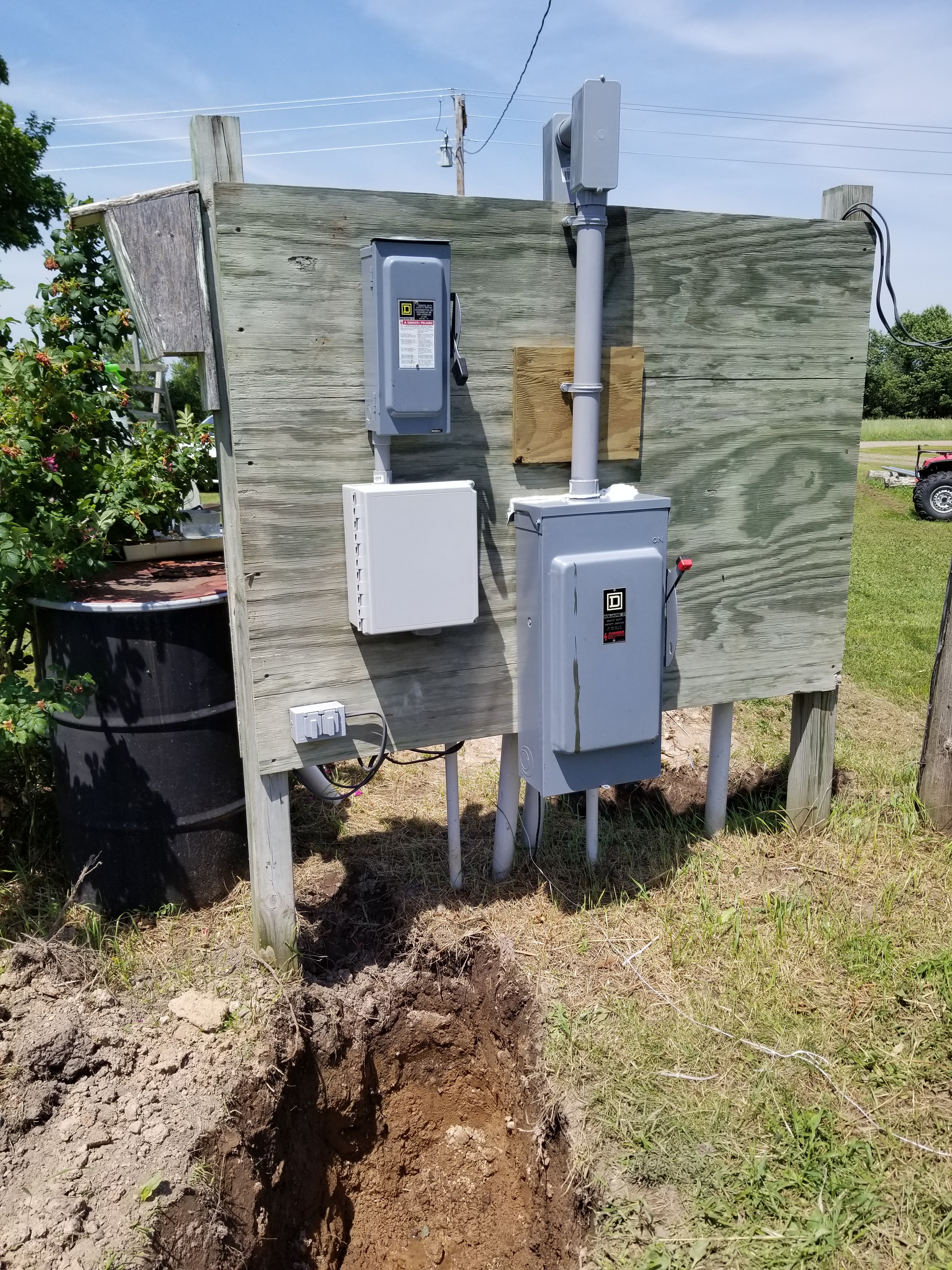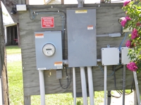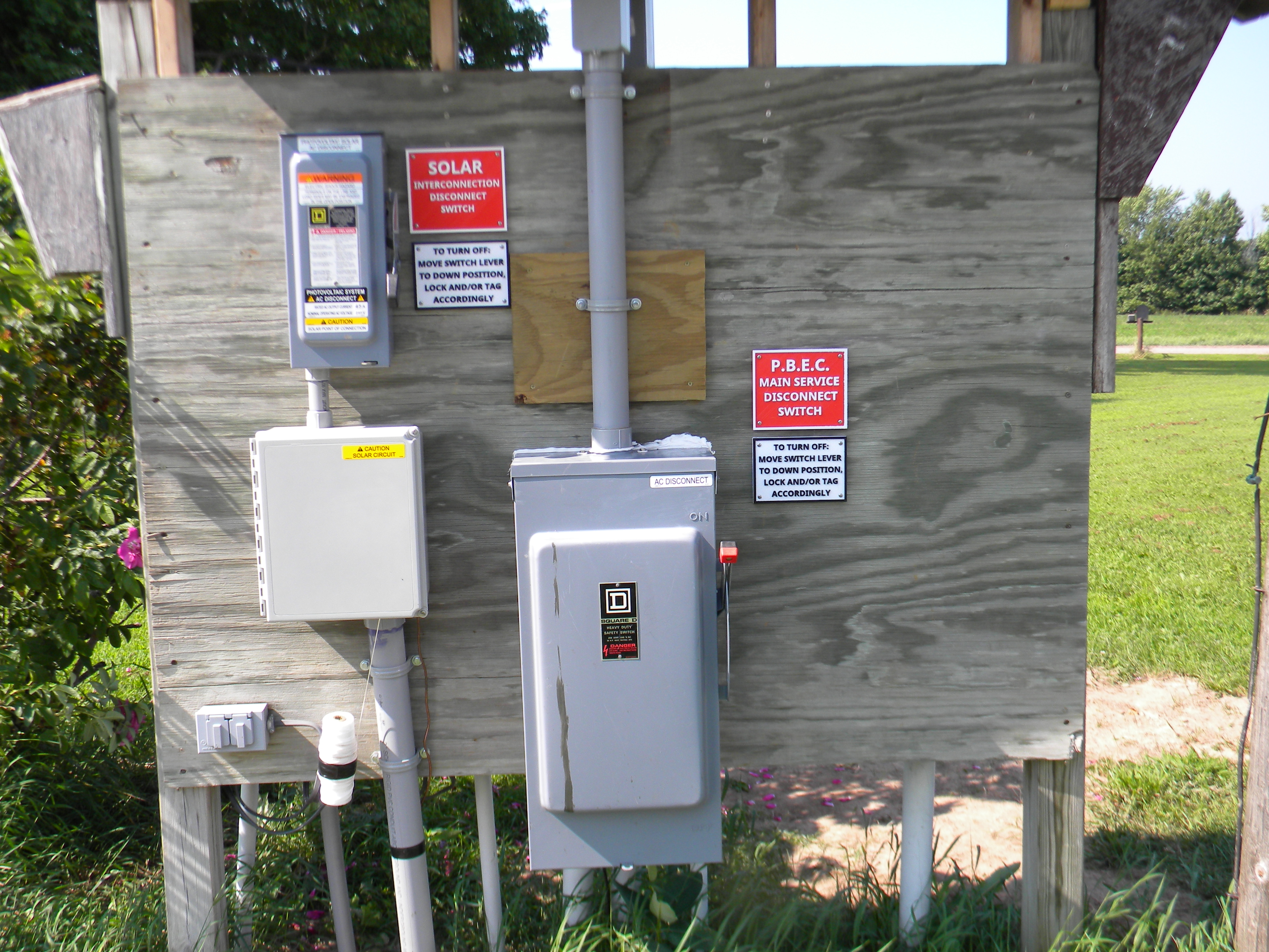 NOTE: Part of the co-generation agreement with Polk Burnett Electric, is that they can come on the property and lock out this switch, any time it is necessary to perform work on the grid. The box on the lower left is a junction box that is serving more or less as an adapter, sizing down the 2” conduit to 1” which fits the switch box without modification. There are many ways we could have downsized the conduit. I chose the junction box so that I could leave a loop of extra wire in there just in case I need it in the future. The Box mounted lower on the right side is a disconnect switch that completely shuts off the power coming from the grid. I installed that more for personal preference, and protection then necessity. |