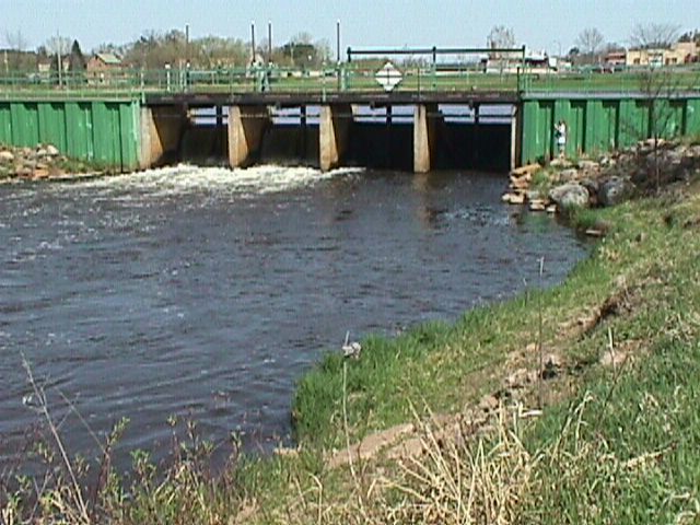 View of the bridge/flood gates. | Looking downstream (West) from the bridge. | View of water flowing over the rocks. |